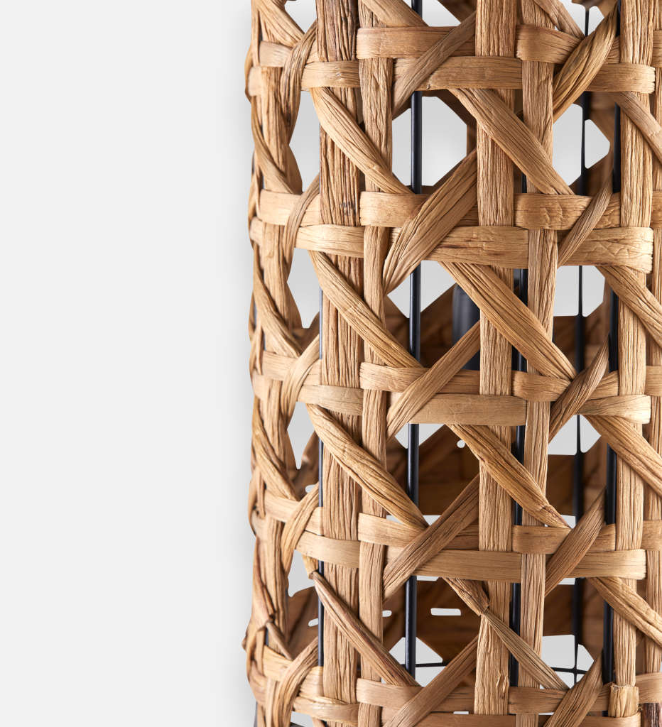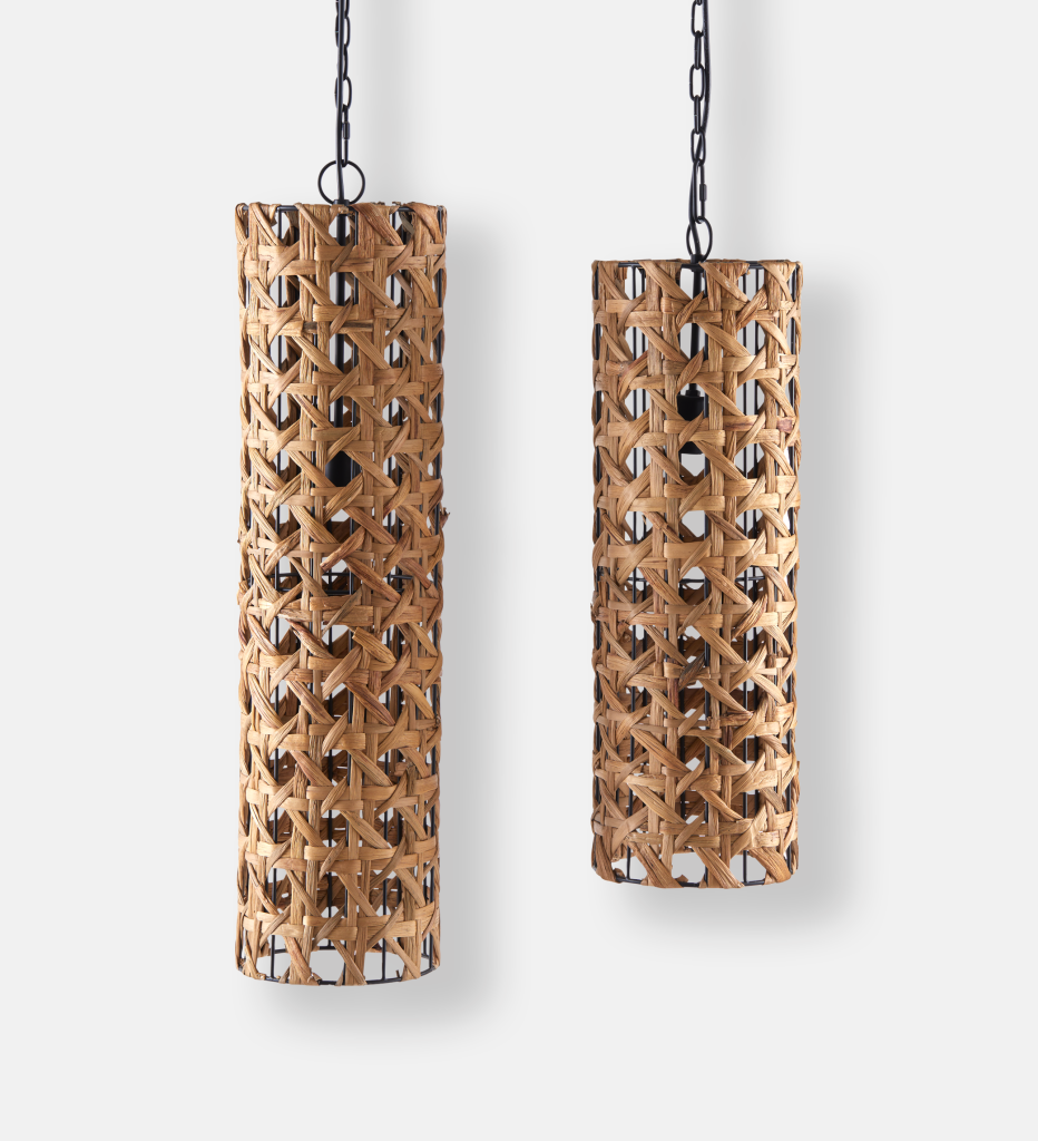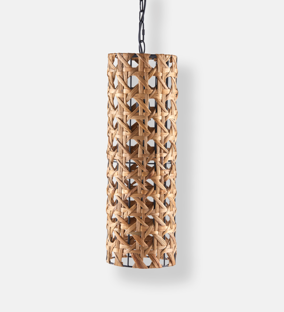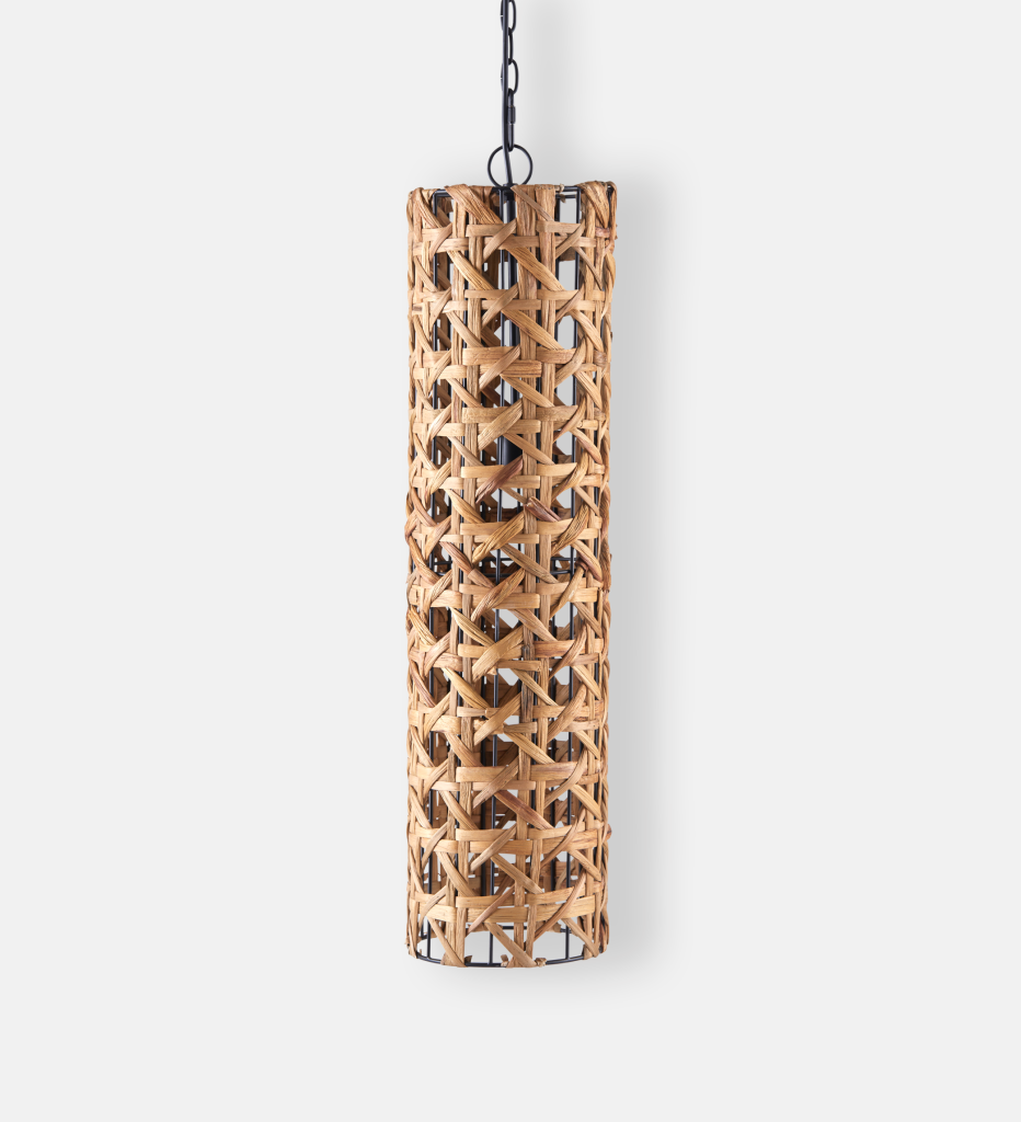 Crafted with precision, this pendant light features a sturdy iron frame that adds a contrasted charm, while the woven seagrass shade infuses a warm, organic texture. The cylindrical design creates a captivating interplay of light and shadow, casting intricate patterns journey across your space. Also available in a larger size.