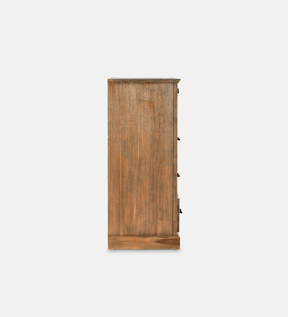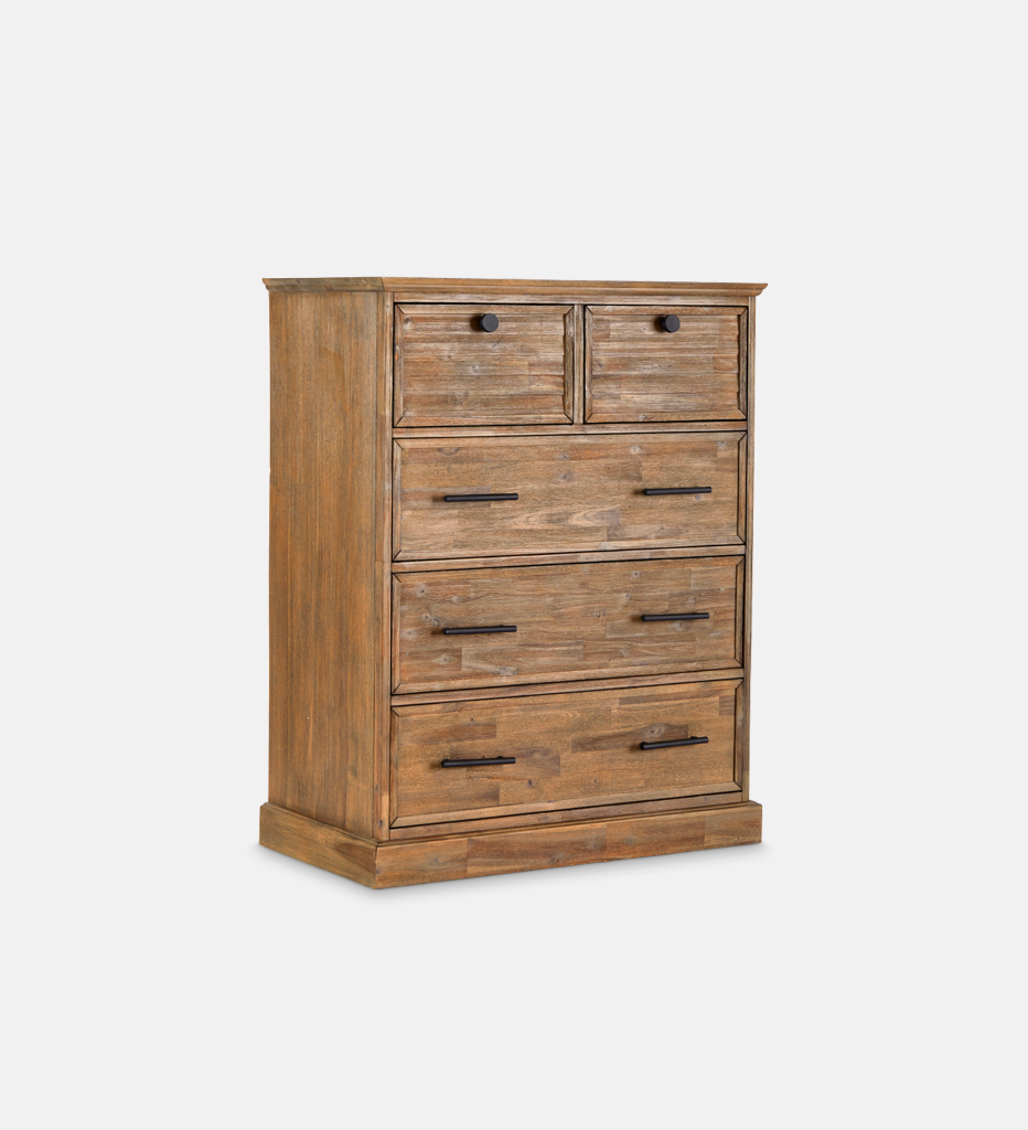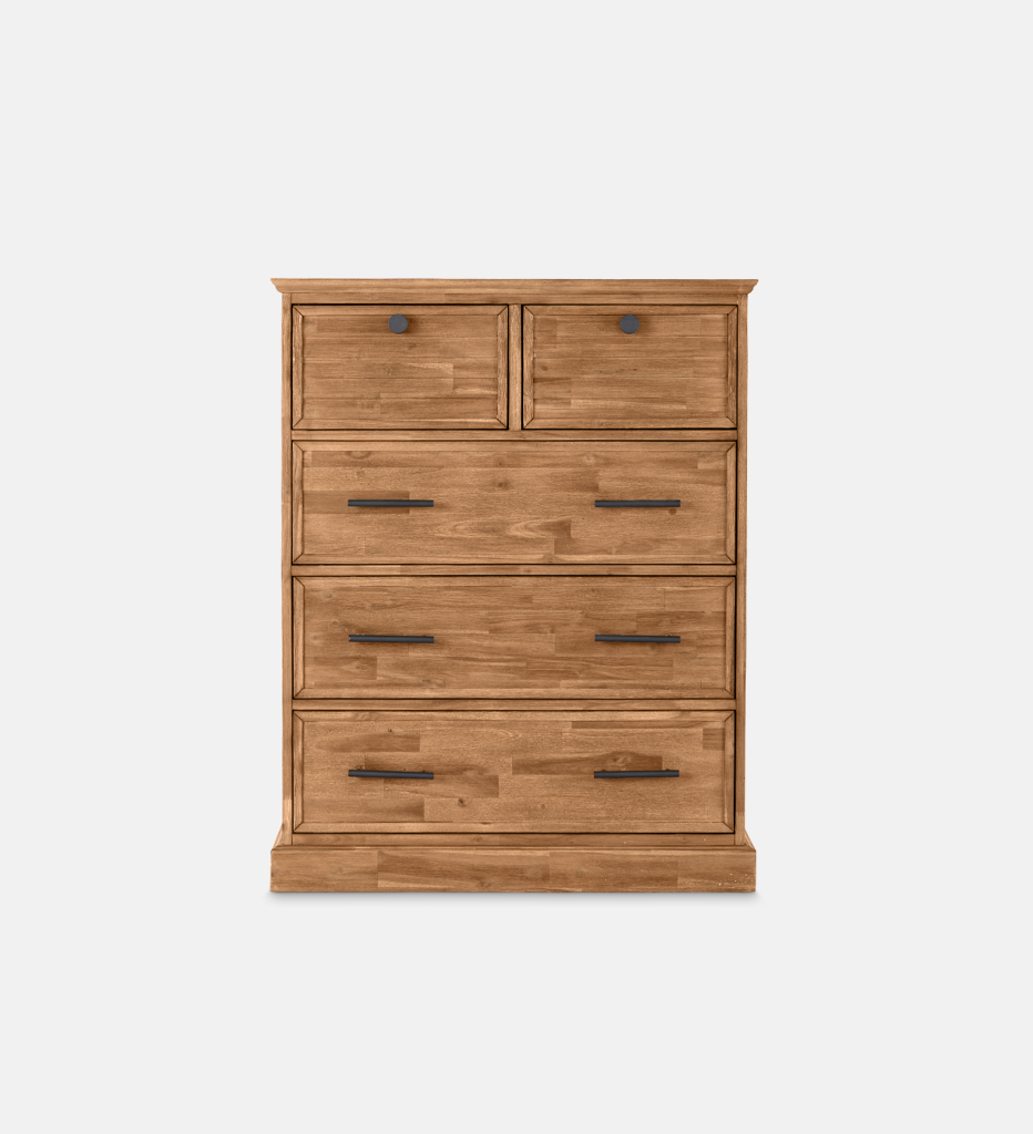 One of our signature ranges, now with updated hardware. The Cresthill chest has five roomy drawers; two with round metal handles and three with metal bar pulls. Made from sturdy acacia wood, the simple, classic design allows the natural grain of the wood to take centre stage. Use it as an accent piece in your bedroom or give it pride of place in the lounge.
