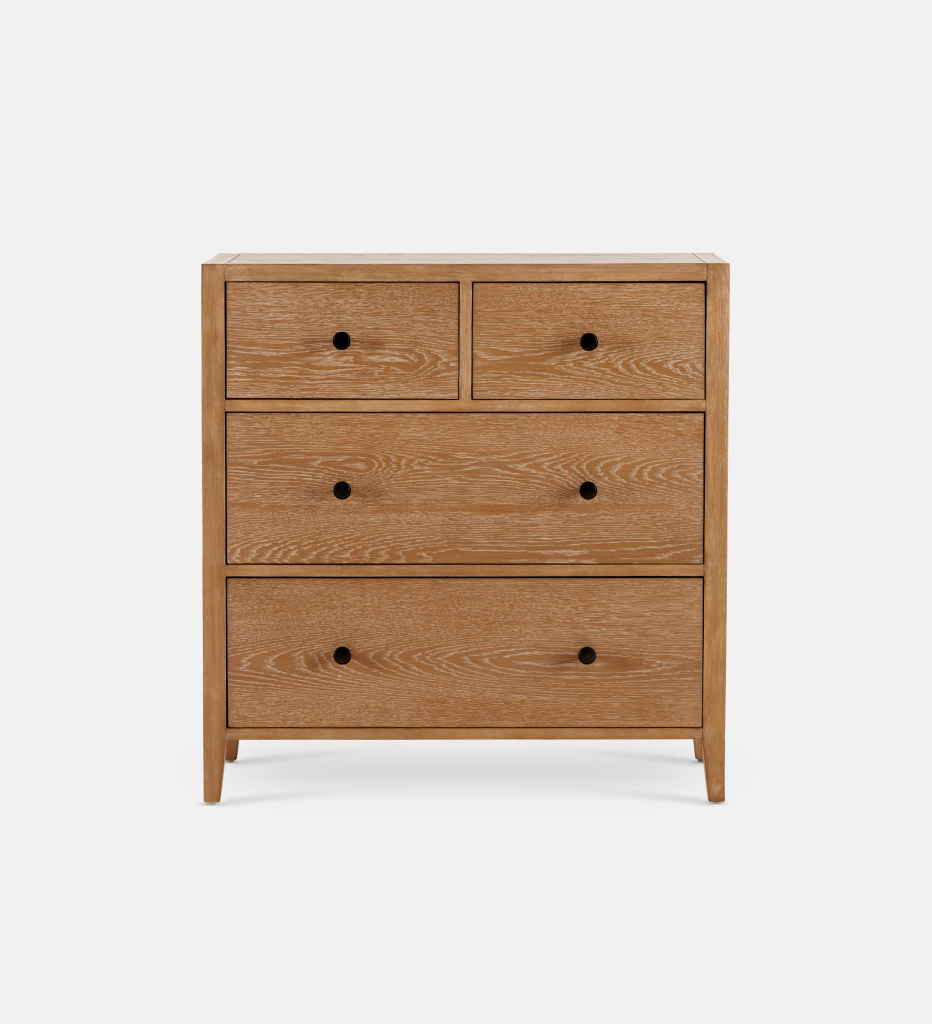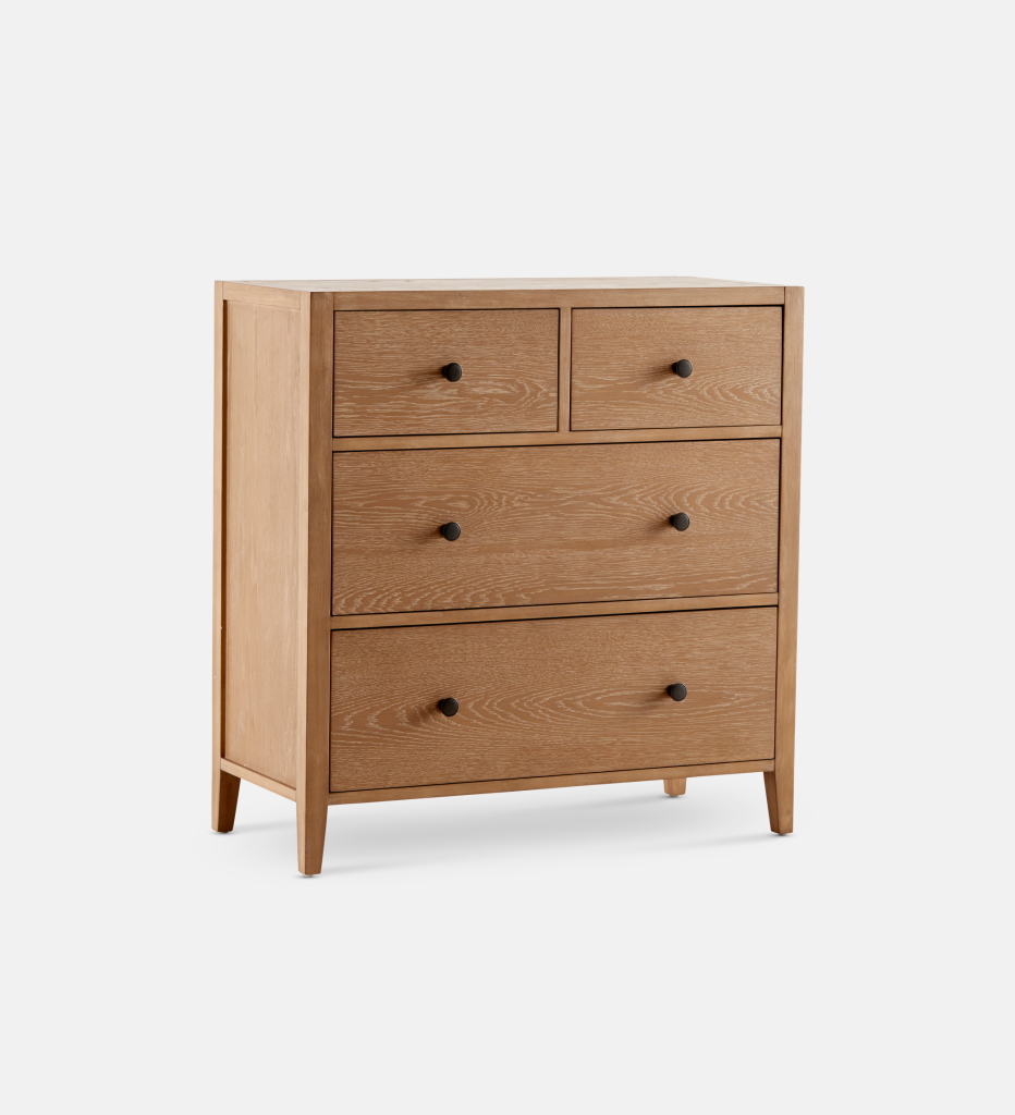Made from solid Rubberwood with an Oak veneer, the Laurel range is a quintessentially classic collection. The Laurel chest comes with plenty of drawer space for an elegant storage solution and has black metal pulls for a contrasted yet stylish look.