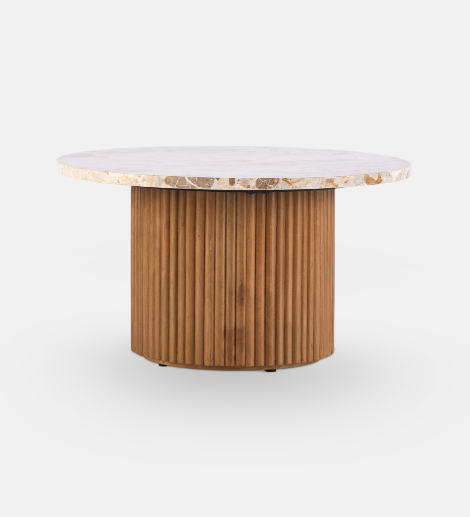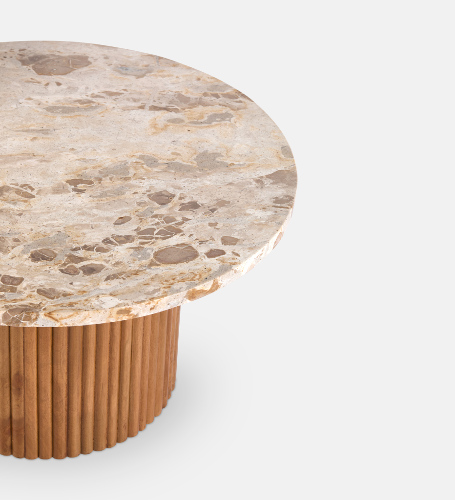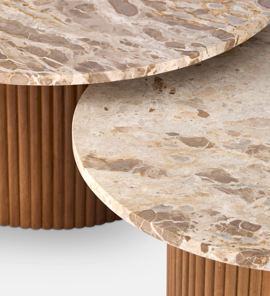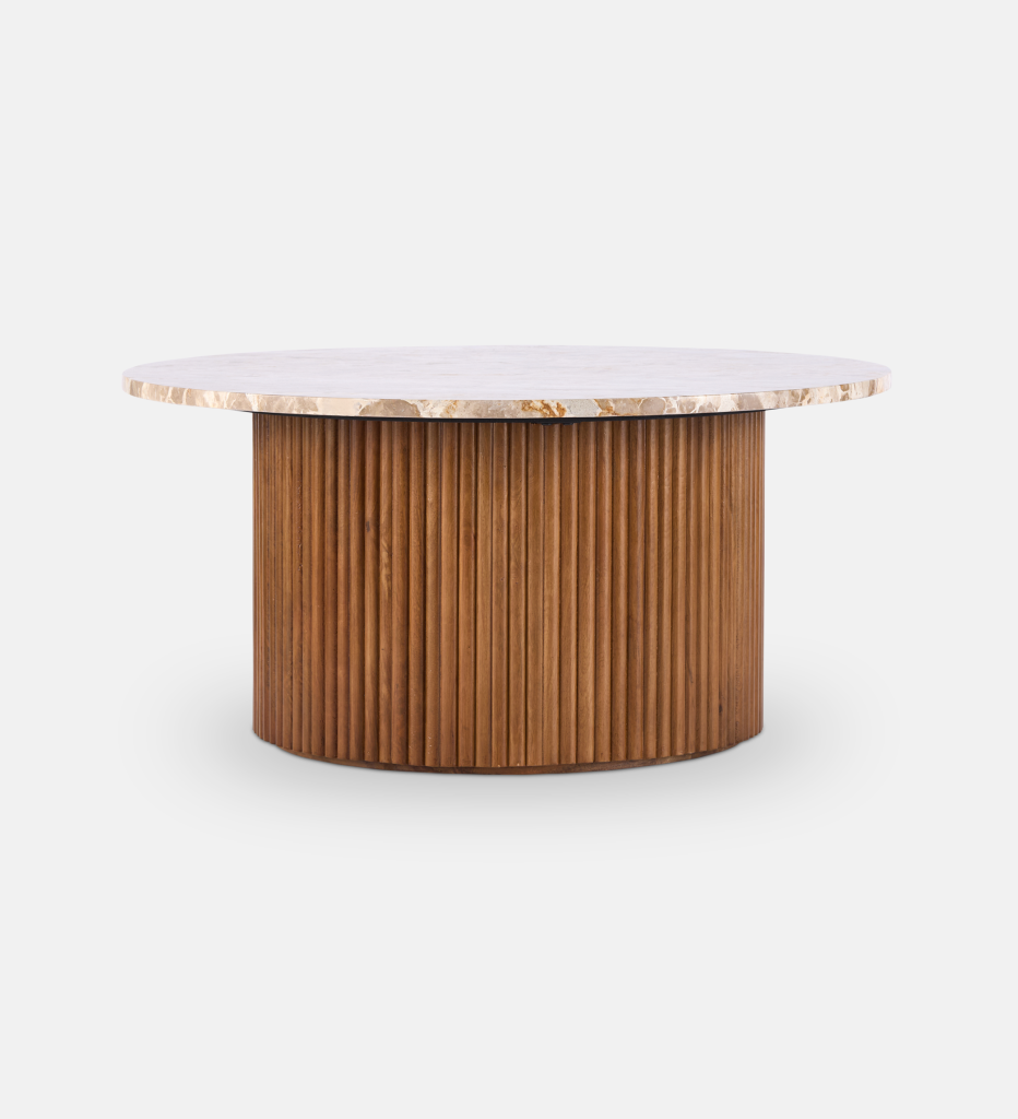 Elevate your living space with our premium round coffee table set, expertly crafted for timeless elegance. Featuring a luxurious marble top with naturally unique veining, each table is a one-of-a-kind statement piece. The base is made from high-quality solid wood and showcases a refined fluted design, adding texture and architectural charm to any interior.