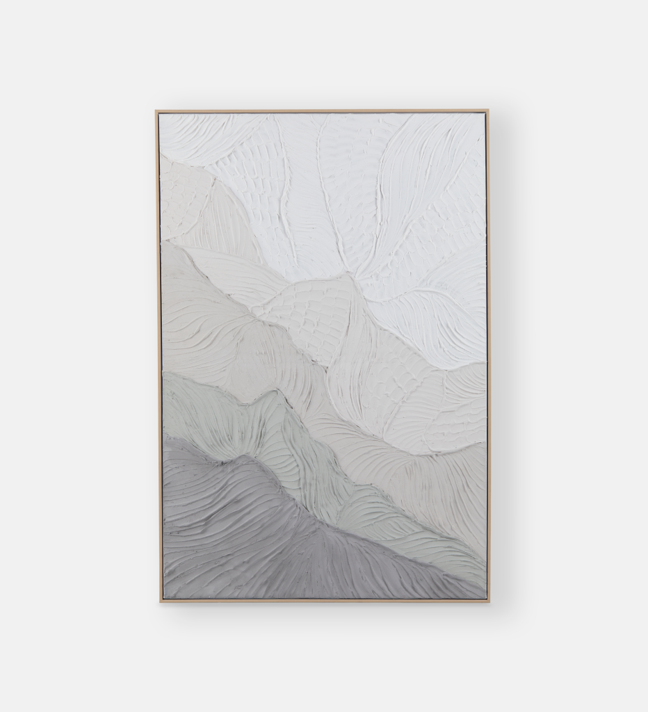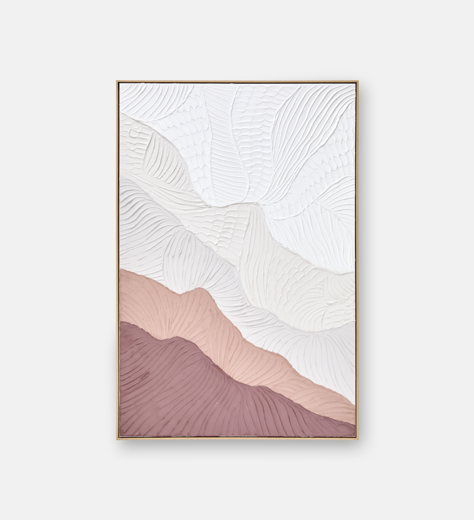 The Rocco Painting is a striking piece of art that adds depth and character to your space. This abstract wall art features flowing, wave-like lines in white and gray on top, transitioning to pink and mauve tones below, framed by a thin metallic border. This painting is perfect for adding a touch of color to your walls.